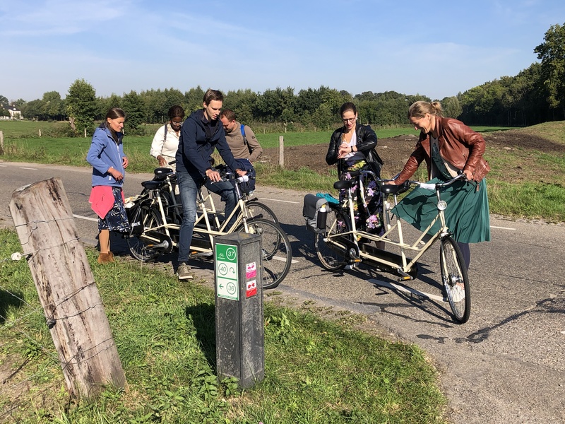 Rond kwart over tien stappen we met acht personen op de tandem. Vrijwilligers van de werkgroep Landelijke actie en het team van de HHJO. Een mooie route via knooppunten vanuit Ede naar het centrum van Amersfoort ligt voor ons. Het is nog fris, maar de zon schijnt.